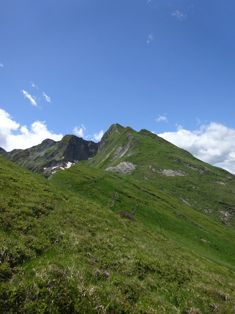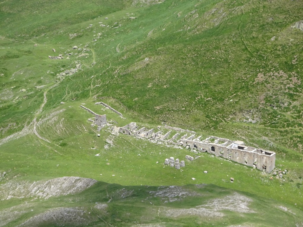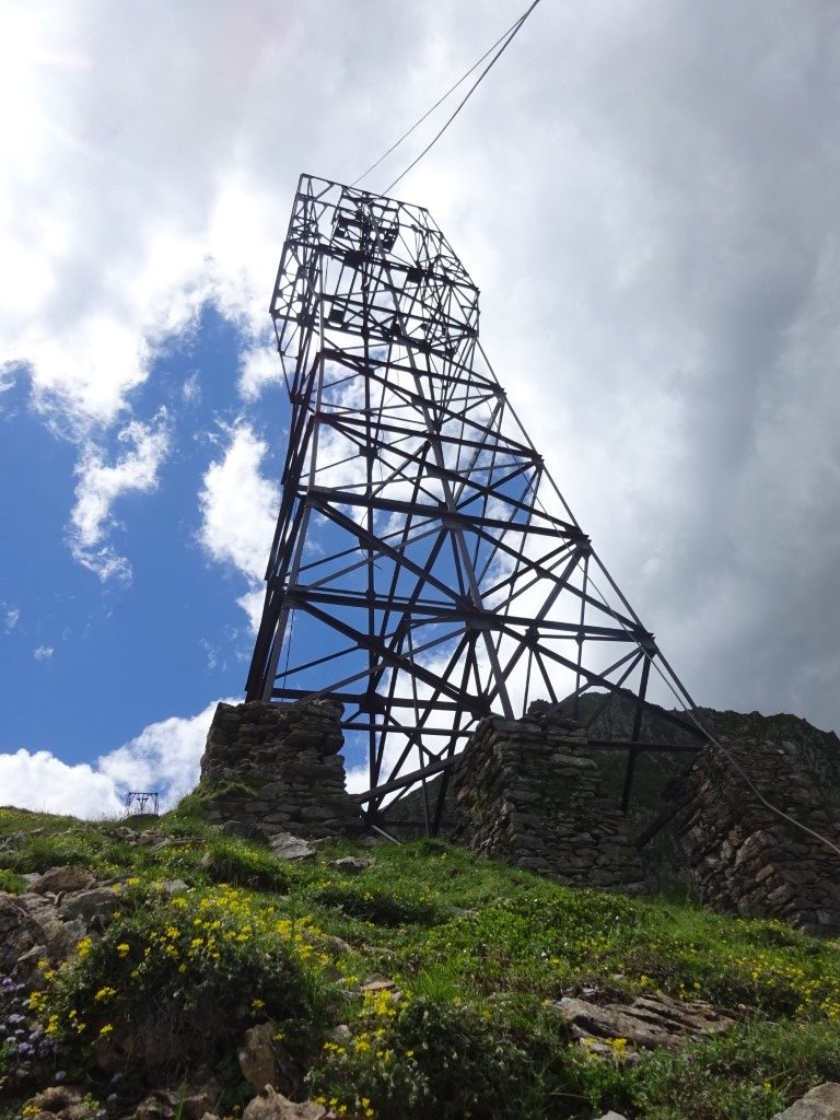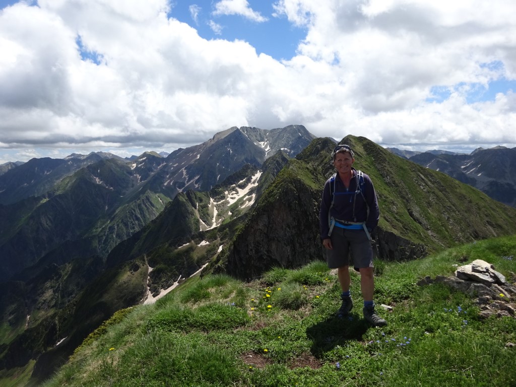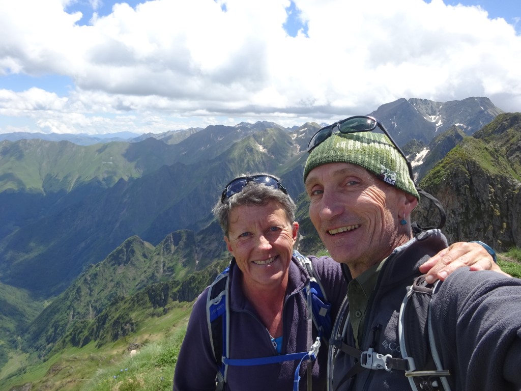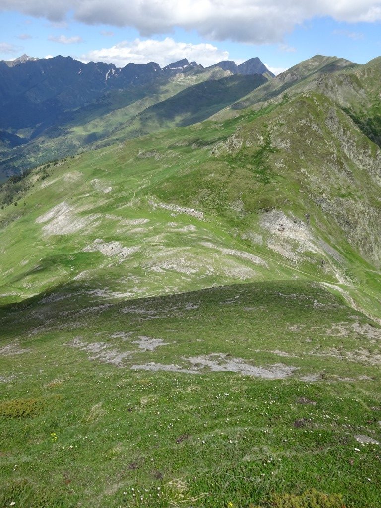 A grey day as we set off from Col de la Pause but that burnt off as we climbed to Etang D’Areau. We tried to find a path behind the refuge to contour around to the Col above Cabane D’Aula. In this respect we were wholely unsuccessful. We found a path that headed in the general direction (probably made by sheep), this then diverged into many smaller paths as each sheep chose their own way. After battling tussocks, thistles and nettles we gained the col and headed up the ridge up to Tuc des Fourmiguet and down to join the GR10.