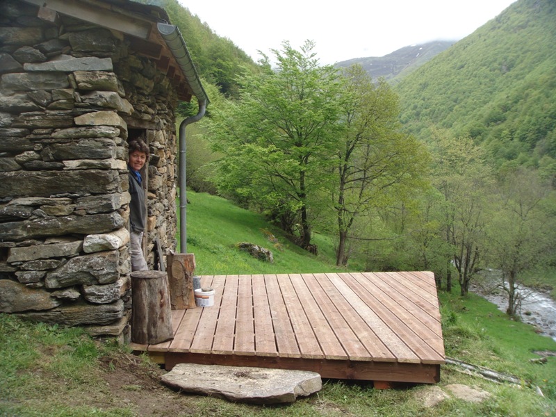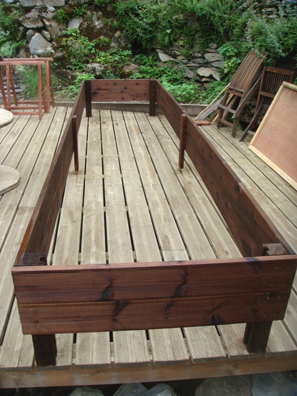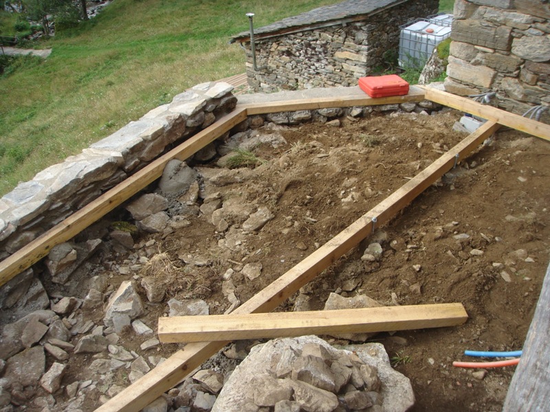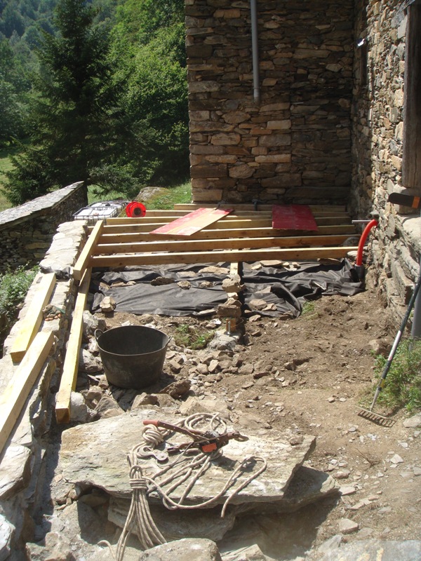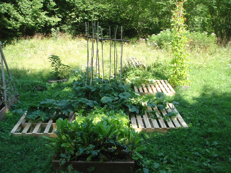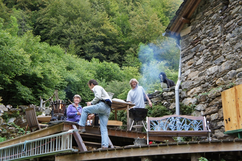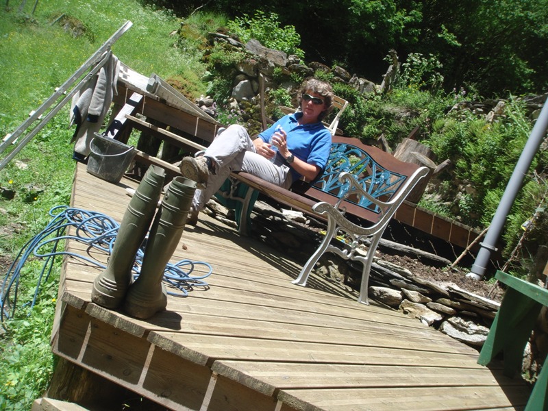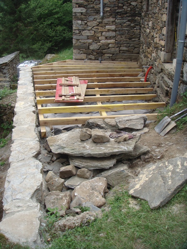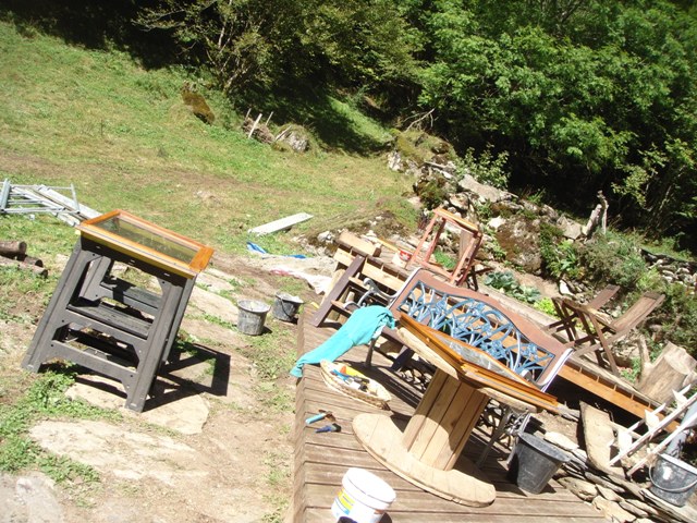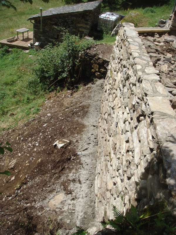 Outside the barn we have built some wooden terraces which give us outdoor living spaces and also flat surfaces to work on. In 2013 a large retaining wall was added at the front to protect the foundations of the barn. Behind are now a number of raised beds for fruit and vegetable growing.