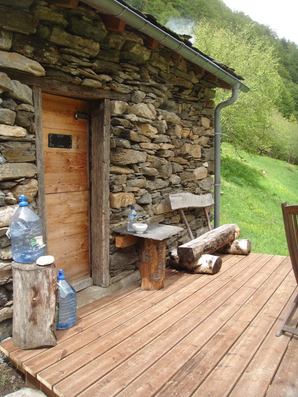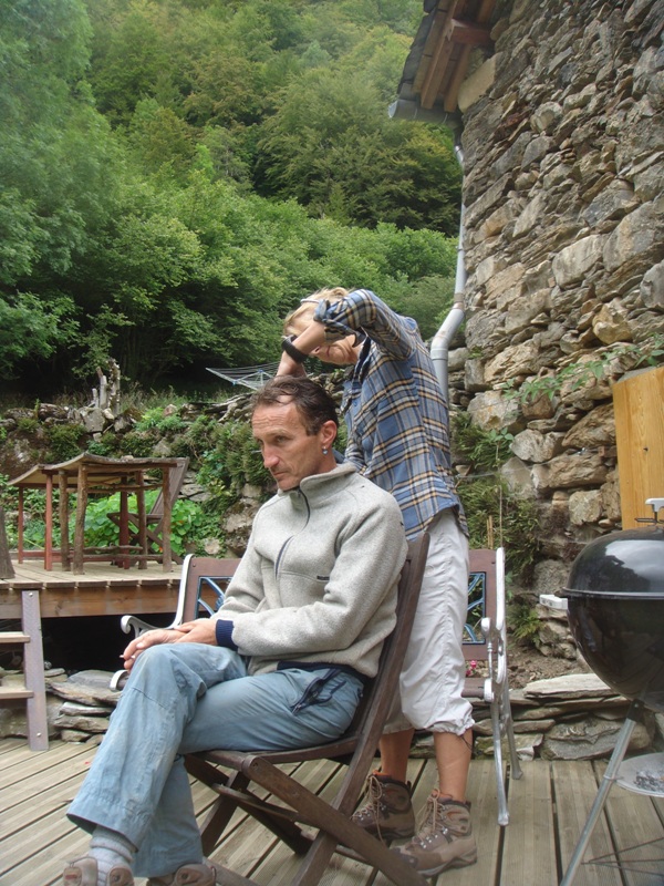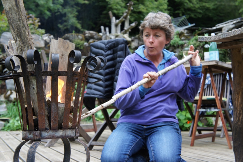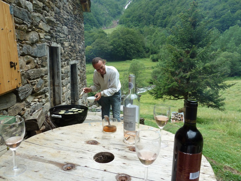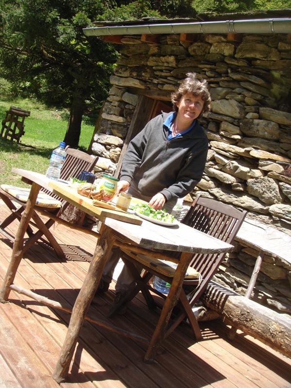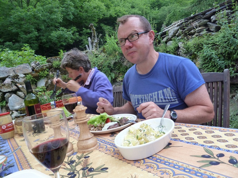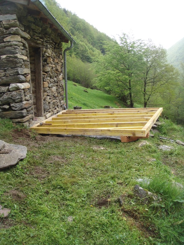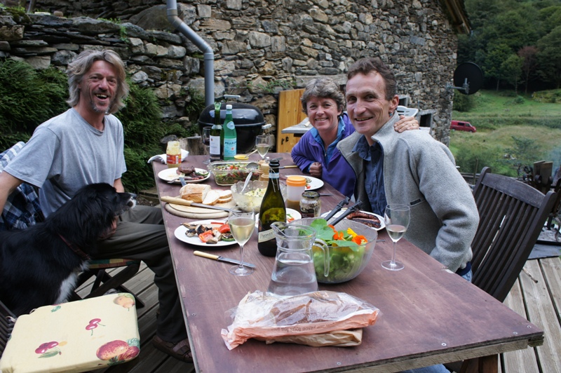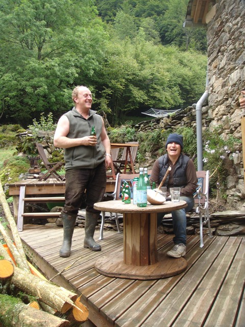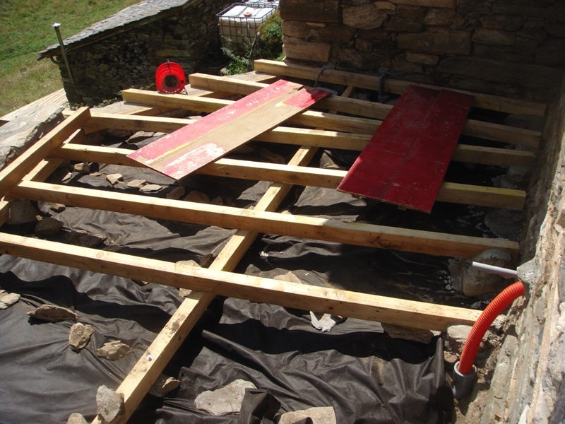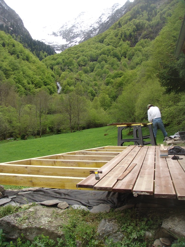 Outside the barn we have built some wooden terraces which give us outdoor living spaces and also flat surfaces to work on. In 2013 a large retaining wall was added at the front to protect the foundations of the barn. Behind are now a number of raised beds for fruit and vegetable growing.