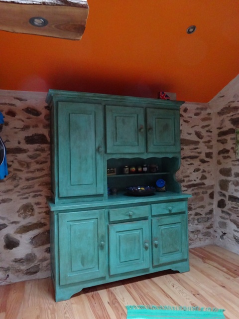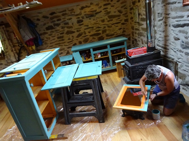 We have been experimenting with chalk paint effects on the big dresserf and some bedside tables. Made a lampshade from a reject turned wooden bowl of Ian’s. Also all manner of small odd jobs to provide variety.