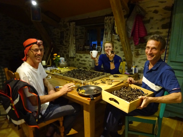 We had a lovely salad lunch on the terrace before going off up to Cirque D’Anglade to mushroom. Sauze knows her mushrooms and we were keen to learn from her. So off piste we went and vertically up we went. Amongst pied de moutons, we found hundreds of trompets! BONUS. We all got quite carried away and excited.