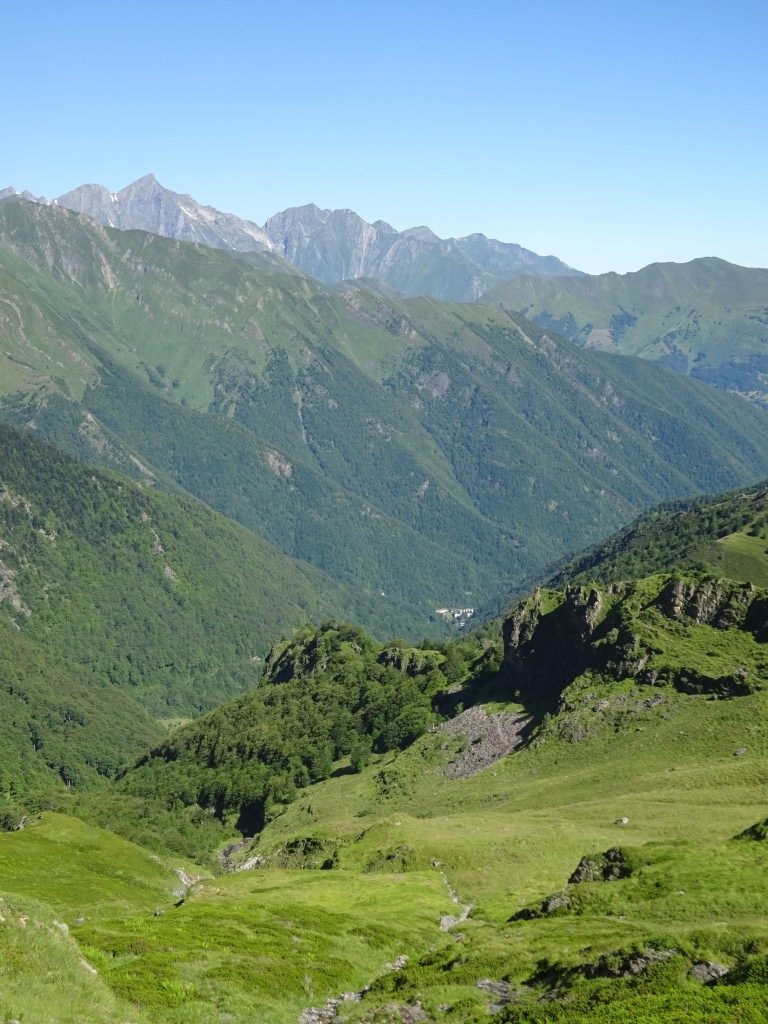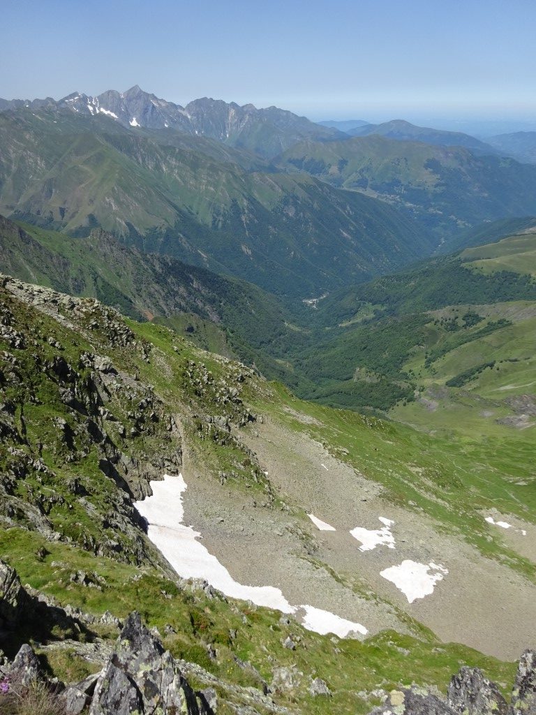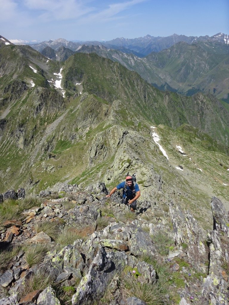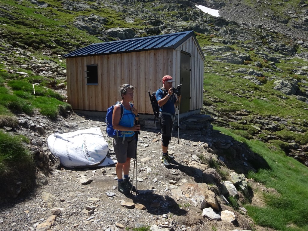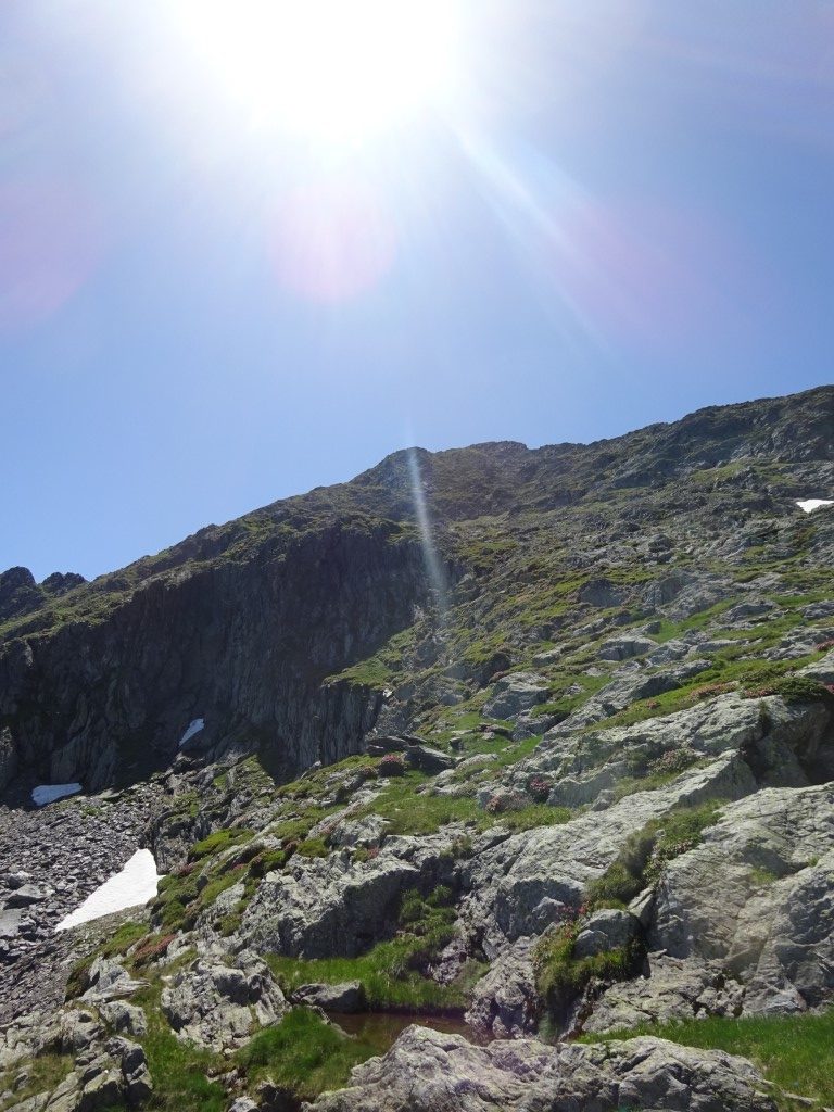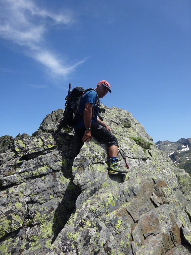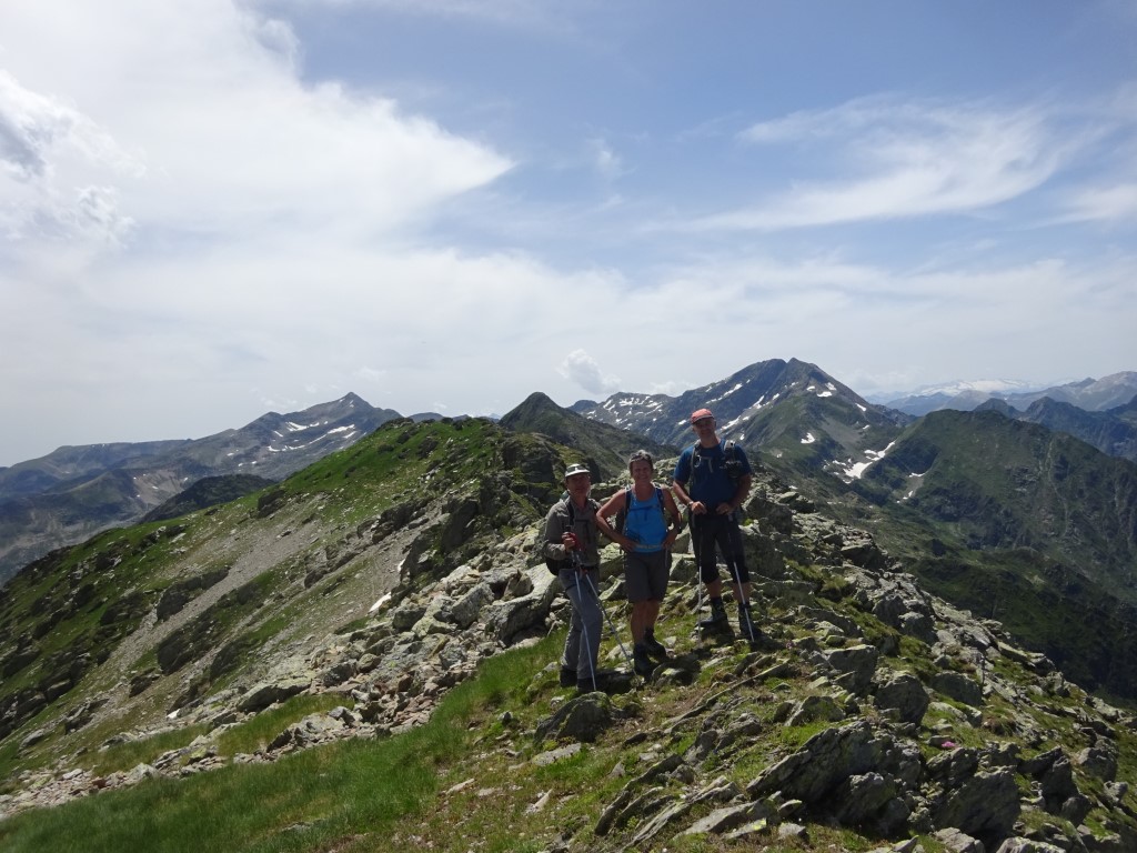 Breezy and I had already decided to go hiking when we got an email from Lee with an idea. This involved meeting at the mine above Salau at 9am the following day and following Lee. Not strictly fair, in that we did know where we were going. Montareing was on Lee’s short list of peaks he had not ascended so far and he had a cheeky little route to get to it which we had not done before. We climbed to Cabane Saube then took a little track off to the west to cross the ridge into the woods and up to a ruin of Cabane Fontaret. From there an indistinct path unmarked by cairns, signs, paint or even a path in places ascended accross the valley and up through some rock bands to a Col (we followed Lee who had used said path before). From there we climbed up to Pic de Montareing via a newly built shepherd’s cabane.