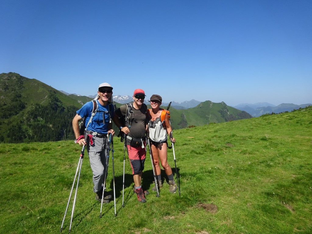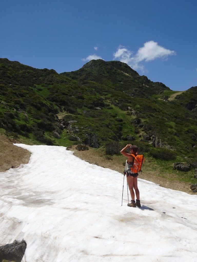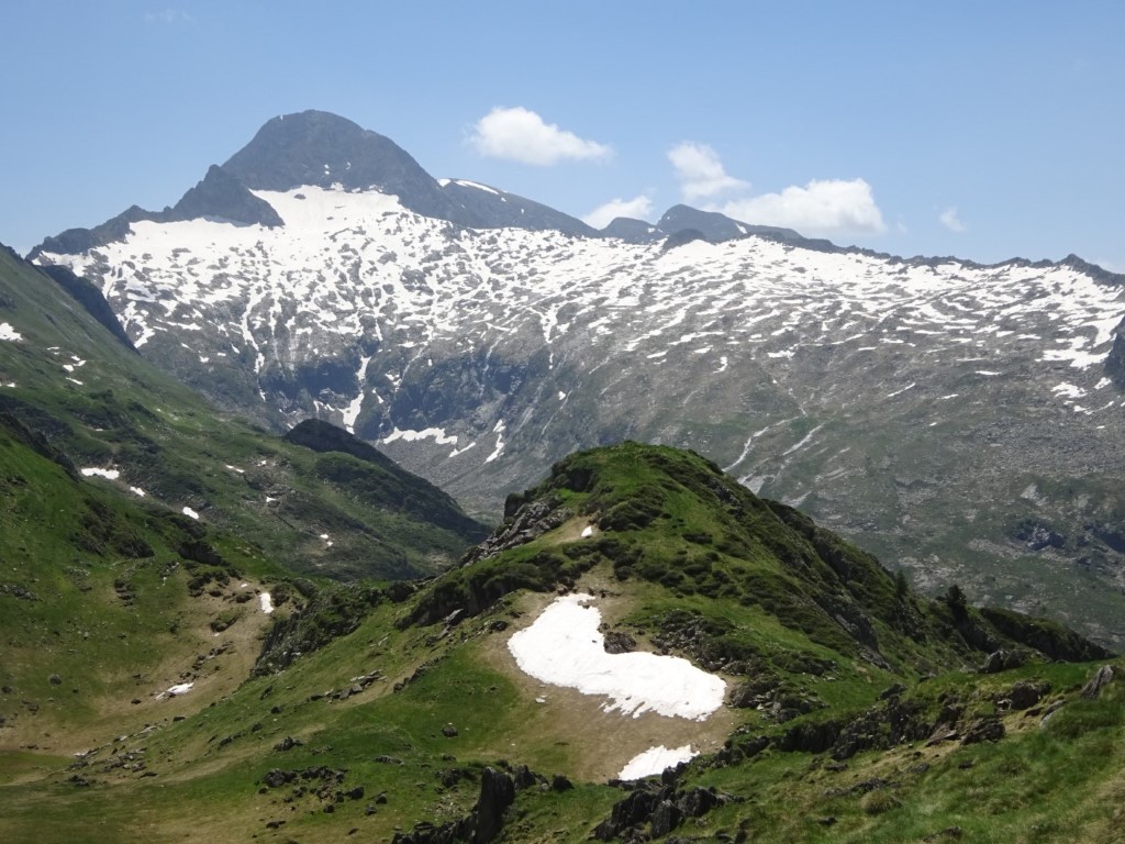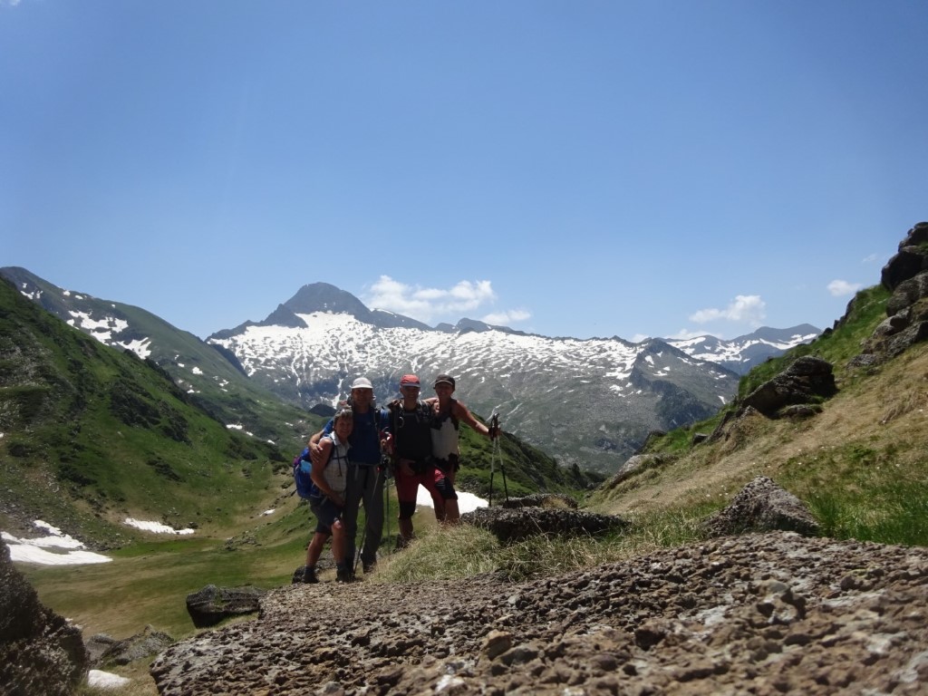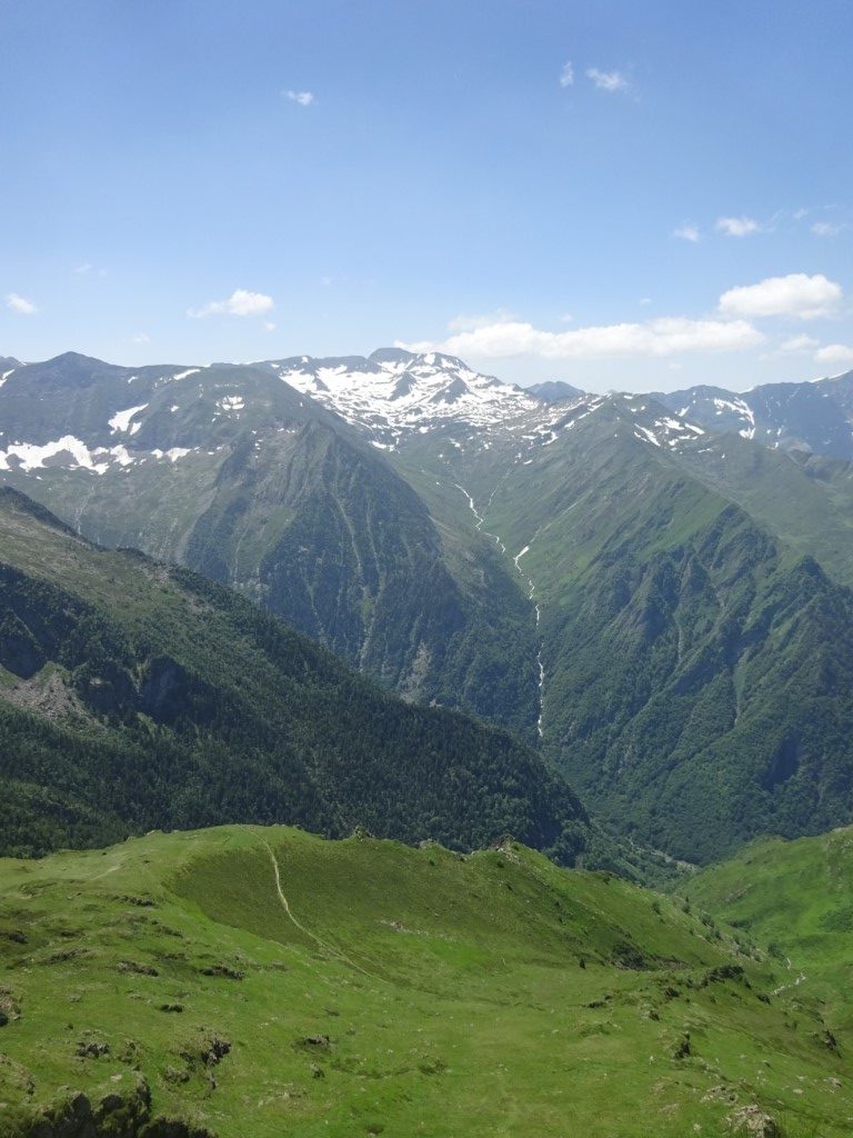 It was a scorching hot day and Lee and Suze picked us up from the bridge in Seix and took us up to Col de le Core. The initial plan was a walk and catchup with a dip in a lake. The GR10 took us up to Etang d’Ayes which is a great swimming spot in a beautiful lake, but we continued up towards Pic Montgarie via Etang Bellonguere (a somewhat muddy pond full of tadpoles). Snow still lingered in sheltered spots on the route up before the scramble to the top which gave magnificent views of Valier. We were fortunate enough to get some close up views of a bearded vulture soaring above and below us.