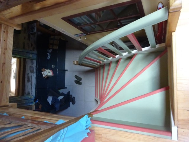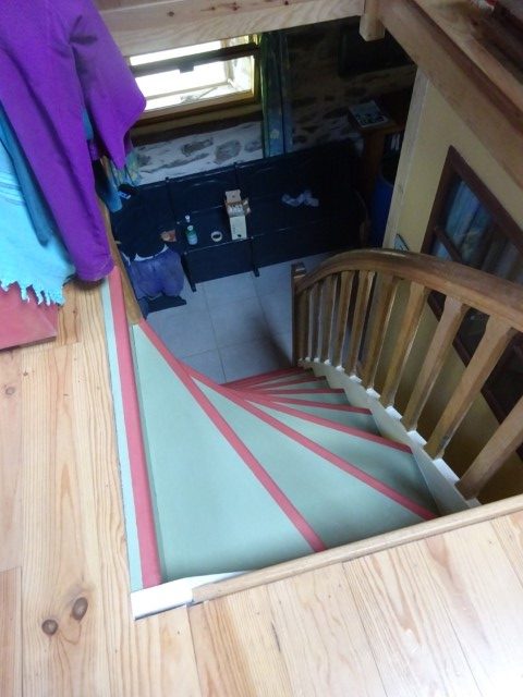 The scorching weather is lovely but slightly too hot to get anything big or heavy done outside. So small indoor projects have been ticked off. The biggest of which has been to freshen up the stairs. Having salvaged the staircase from a mate’s house in Chamonix; dismantled and cut the stringers in half so it all fitted in the van, transported to the Ariege and then renovated the barn around the pile of bits for 3 years, once reassembled they happen to fit in place with about 3mm tolerance. Since then they have been in dialy use but received no TLC at all. So they got a paint job.